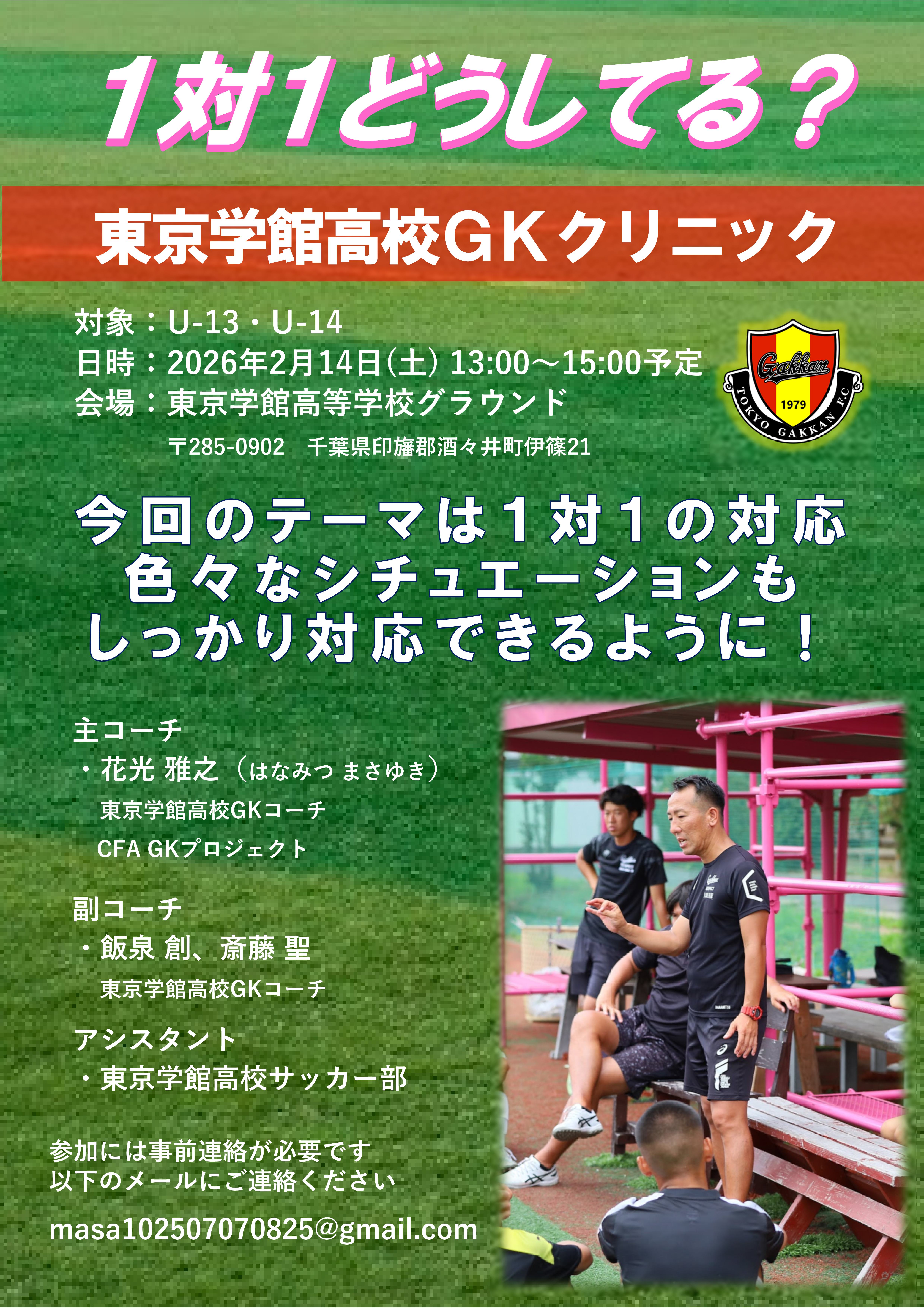 U-13・U-14向けに開催している東京学館高校GKクリニックでは、この度「1対1の対応」を目的とした内容でクリニックを開催します。漠然と1対1に向かうのではなく、タイミング、態勢、ポジショニングなど、この機会に習得してみてはいかがでしょうか?